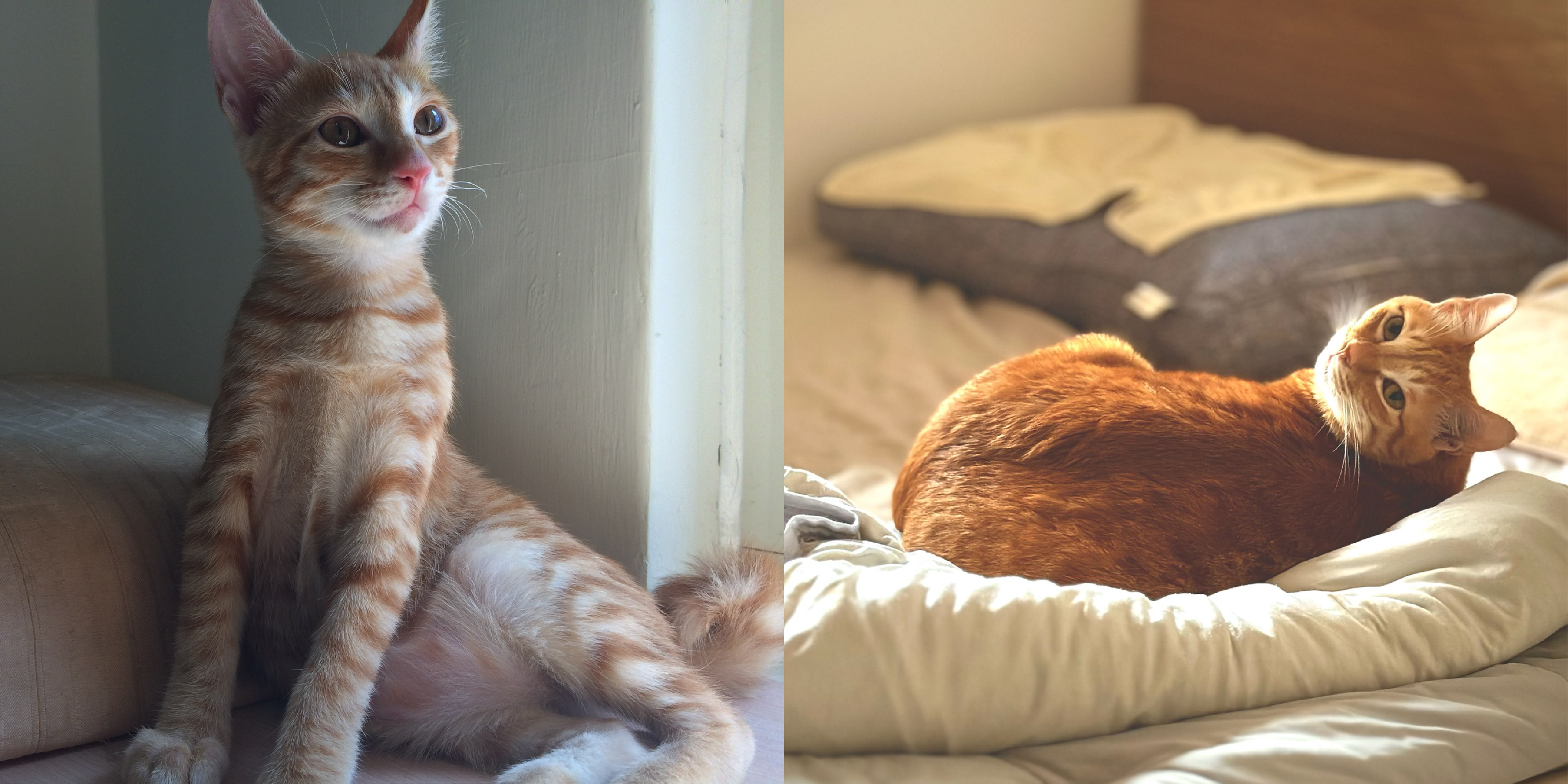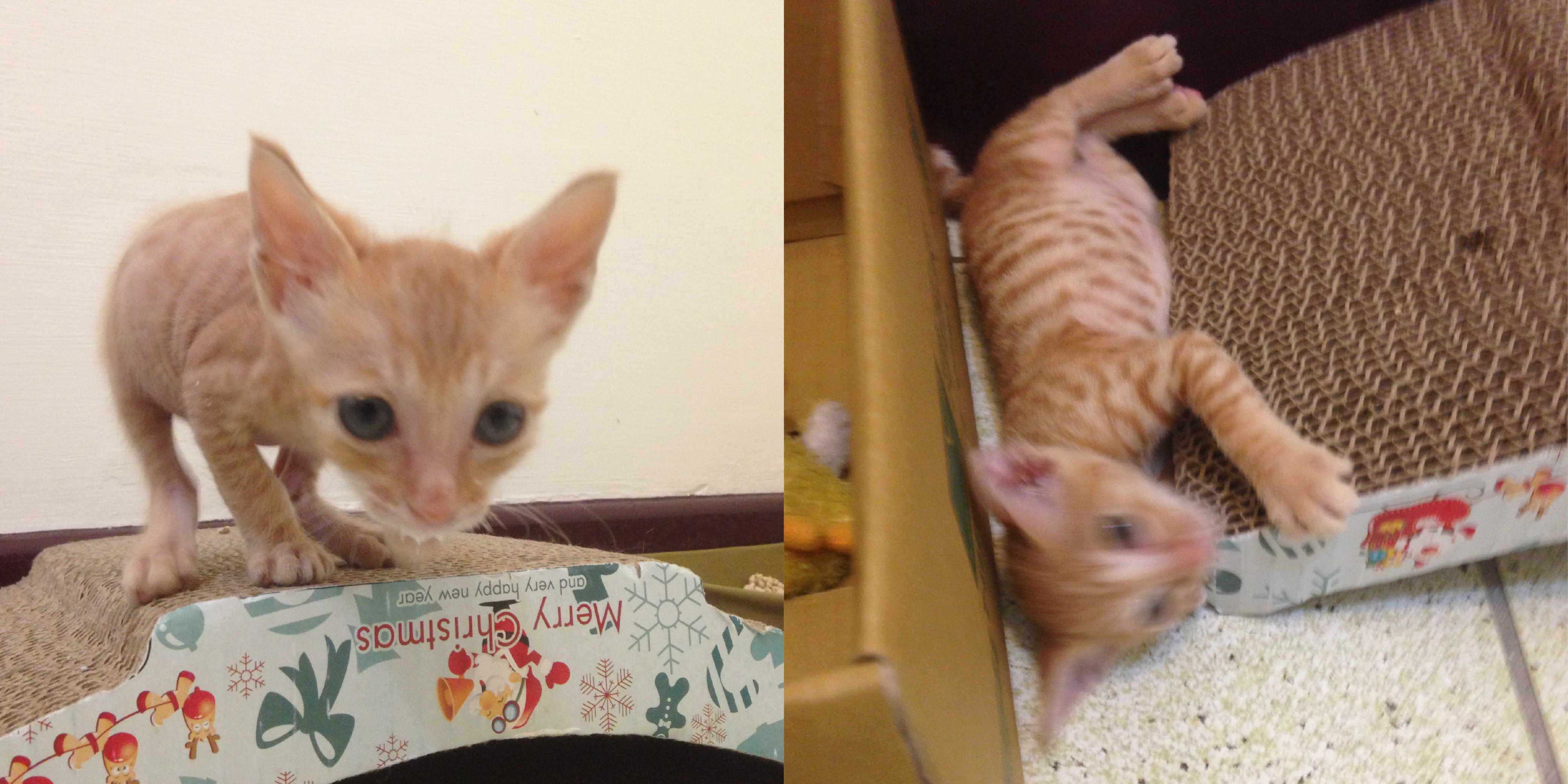 這一窩小貓因為沒有喝過貓媽媽的奶,營養與先天抵抗力不足,幼貓時的長相並不如大家所熟知的那麼可愛:頭小小的眼睛卻很大,肚子大大的四肢卻又略嫌乾瘦,全身毛還很稀疏,簡直就像外星生物一樣。我們餵了一個月的幼貓專用食物以及營養品,才讓毛長出來,身材比例也更為正常,終於比較像地球生物了。
