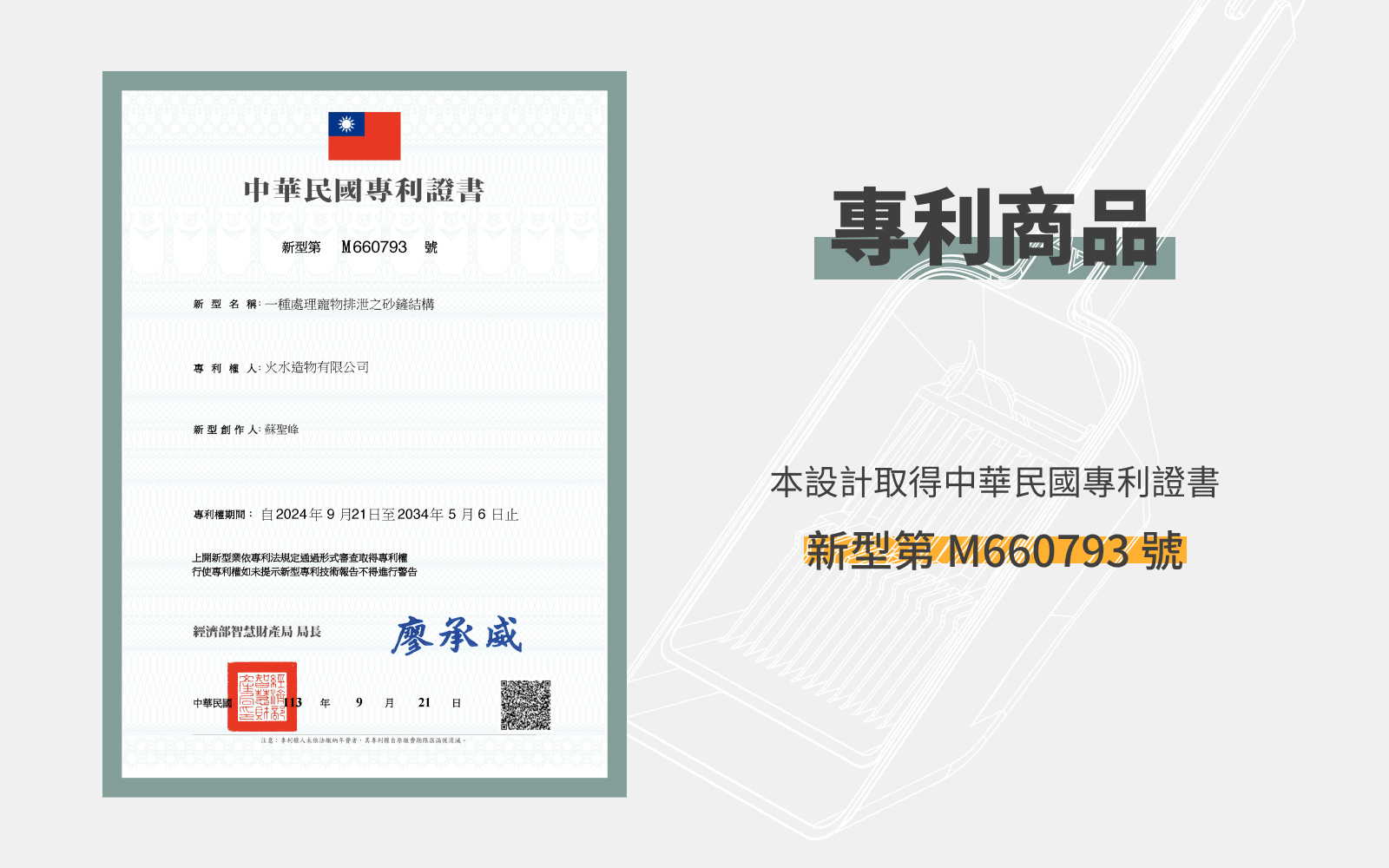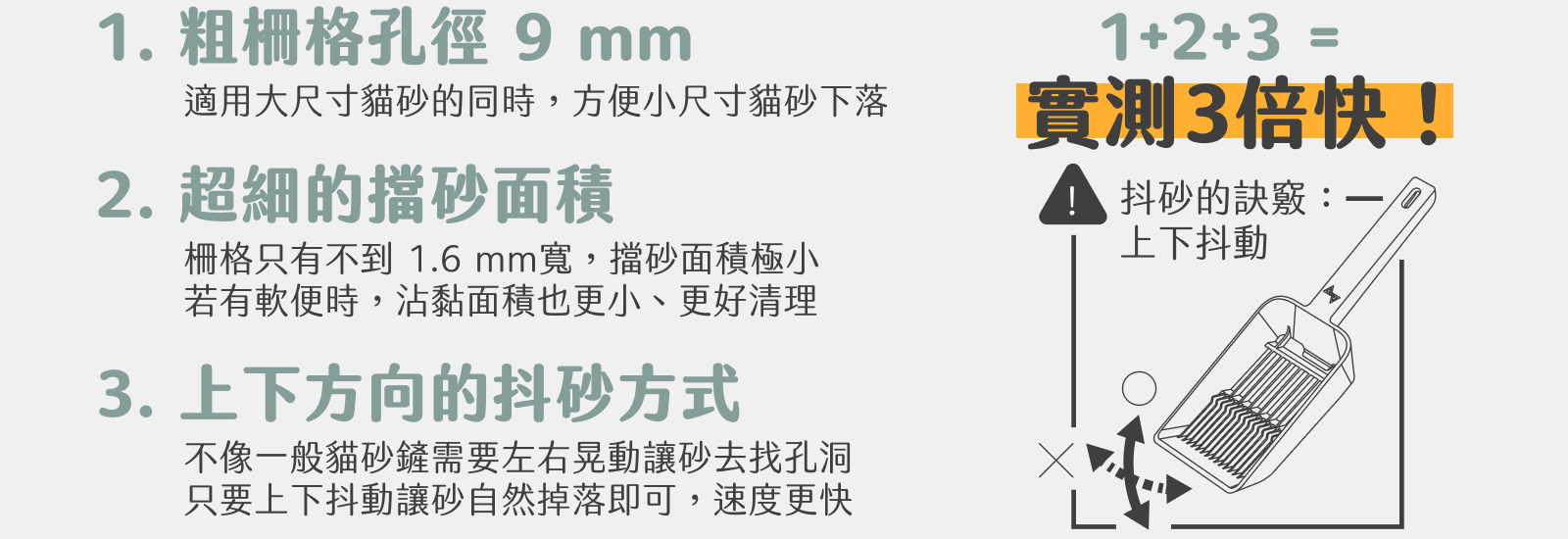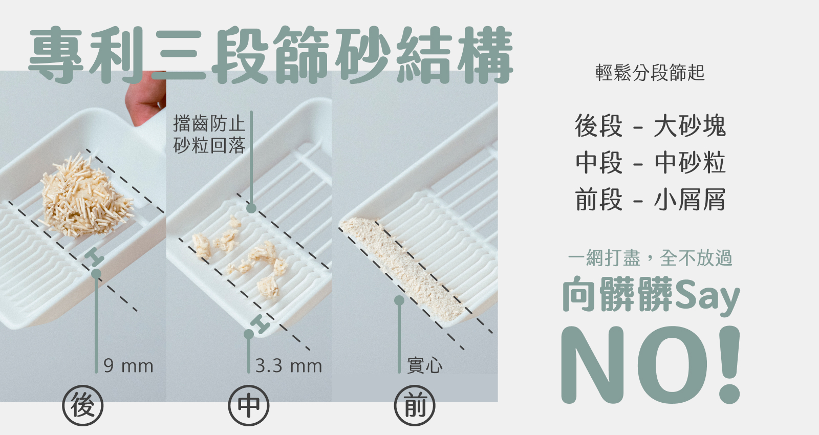 ✓ 專利三段篩砂,大小砂塊精準篩除
